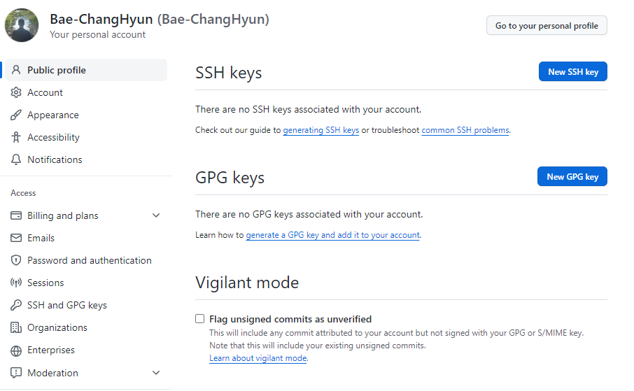 이제 공개키는 github에 등록됐고, 개인키는 내 pc에 저장되어 있다.