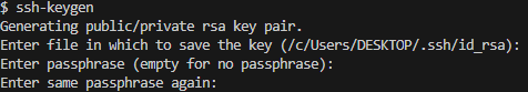우선 첫번째 Enter file in which to save the key (/c/Users/DESKTOP/.ssh/id_rsa): 여기는 아무것도 입력하지 않아도 된다.