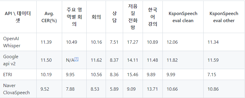아래 리턴제로라는 기업에서 관리하는 github에서 이런 stt모델들의 성능을 비교한 실험이 있어서 잠깐 살펴보니 etri도 준수한 성능을 보이는 것으로 보였다. ( CER? 이라는 지수로 계산했다고 하는데,, 잘 모른다. 그냥 숫자가 낮을수록 좋다고한다.)