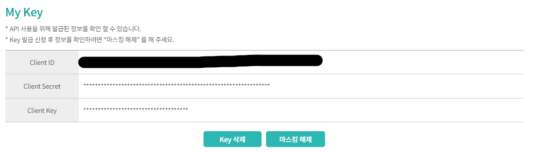 사용신청을 완료한 후, 발급되었다는 댓글을 확인한다음 메인화면의 상단에 Developer Console에 Developer에 들어가서 본인의 Client ID, Client Secret, Client Key를 확인할 수 있다.