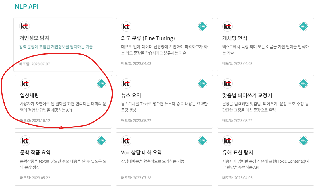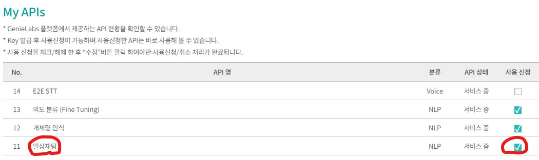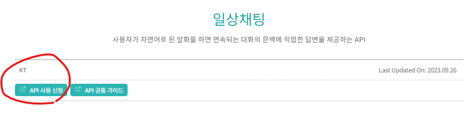 상단의 API에서 신청하고자 하는 API에 맞게 이동한 후 클릭한다. (나는 NLP API의 일상채팅 API를 발급받아보도록 하겠다.)