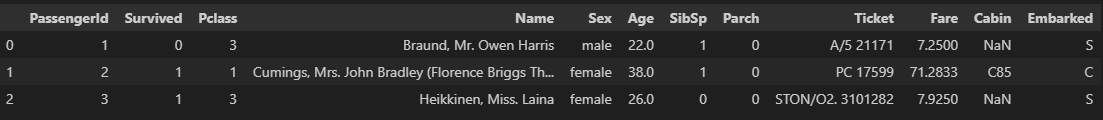 아래와 같이 데이터프레임 객체에 .shape를 써주면 891개의 row와 12개의 column shape을 나타내준다.