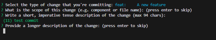 우선 type을 선택할 수 있고, 다음으로 진행하면, scope, description, body 등등 이전에 설명한 conventional commit 형식에 맞는 문장들을 작성, 선택할 수 있게 된다.
