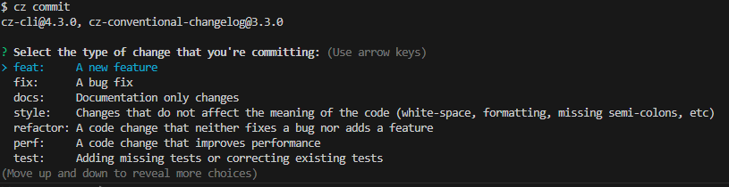 그리고 기존에는 commit을 할 때 `git commit`이라는 명령어를 사용했는데, 이 commitizen을 사용할 때는 `cz commit`이라는 명령어를 사용한.(나머지 push나 pull 이런 건 그냥 git 동일)