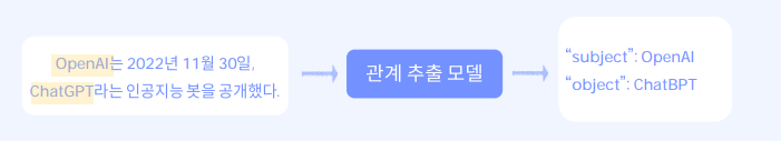 : 텍스트에서 의미론적인 관계를 추출하는 작업 - 주로, 개체 간의 관계를 판별하는 작업으로, 주체와 대상으로 구성.