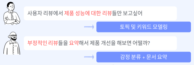- 자연어 처리 기술 자체는 문제에 대한 설루션이며, 문제정의를 명확히 해야만 정확한 기술을 찾을 수 있음.