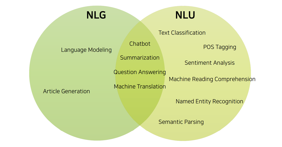 `자연어처리(NLP-Natural Language Processing)` = `자연어이해(NLU-Natural Language Understand)`+`자연어생성(NLG- Natural Language Generation)`