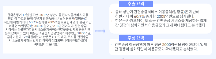 추상요약: 문서를 이해하고 실제 요약하는 느낌.