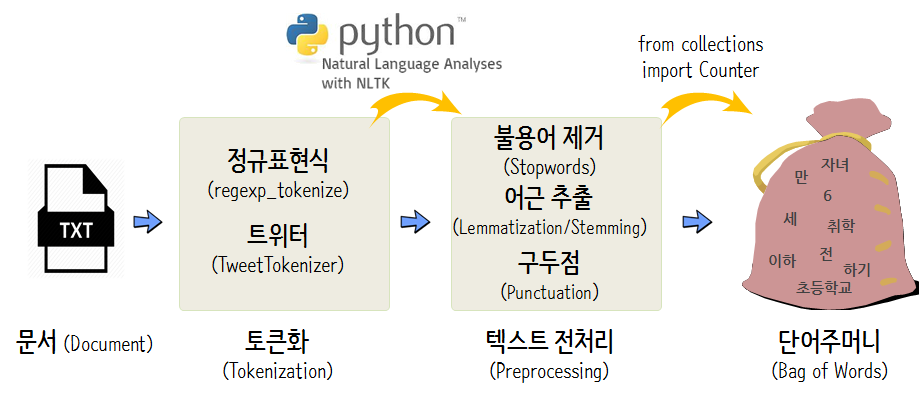 - 수집한 데이터의 분석을 진행한 후 전처리 단계에서 잠재적인 문제를 해결. 실제로 자연어처리 진행에서는 데이터 수집 및 전처리 과정의 비중이 매우 높음.