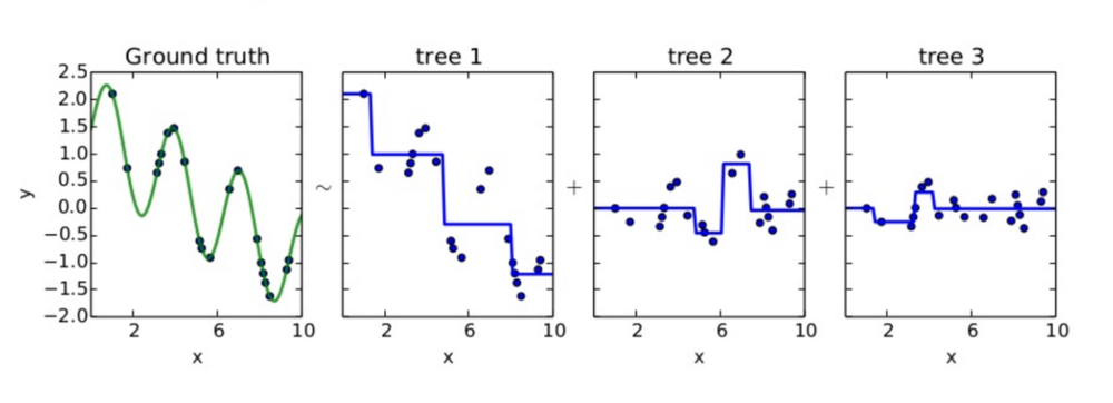 위의 말을 쉽게 적어보자면, 모델 A를 이용하여 $y$를 $y_1$이라 예측했을 때 다음 모델 B는 y가 아닌 $y-y_1$을 예측하는 방식으로 학습된다. 마지막에 이 A, B 모델을 합쳐 y를 예측한다. 그러나 이러한 방식은 과적합을 유발할 수도 있다.
