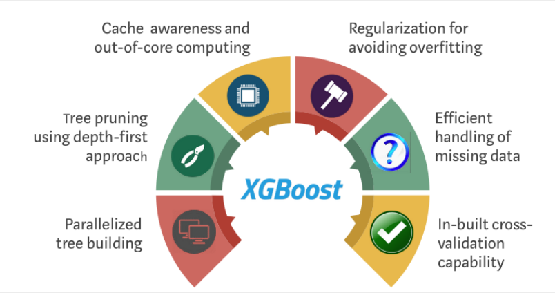동일한 Gradient descent방식을 이용하지만 하드웨어 최적화(분산, 병렬처리)를 통해서 더 빠르고, 과적합 방지를 위한 Regularization이 있으며 분류와 회귀 모두가 가능한 모델이 XGBoost이다. 또한 c++로 구현이 되어있어 빠르다.