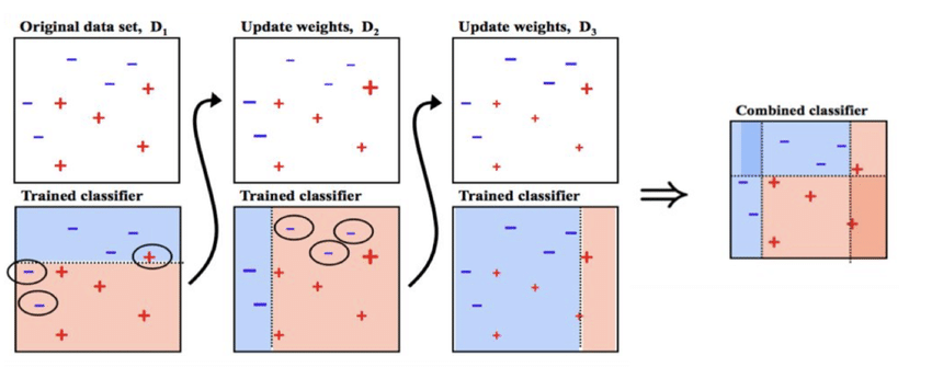 분류하기 어려운 것들에는 가중치를 더하고, 분류하기 쉬운 것들에는 가중치를 줄이면서 가중치를 업데이트한다. 이때 약한 학습기 즉 각각의 분류기는 Decision Tree를 약한 학습기로 사용한다.