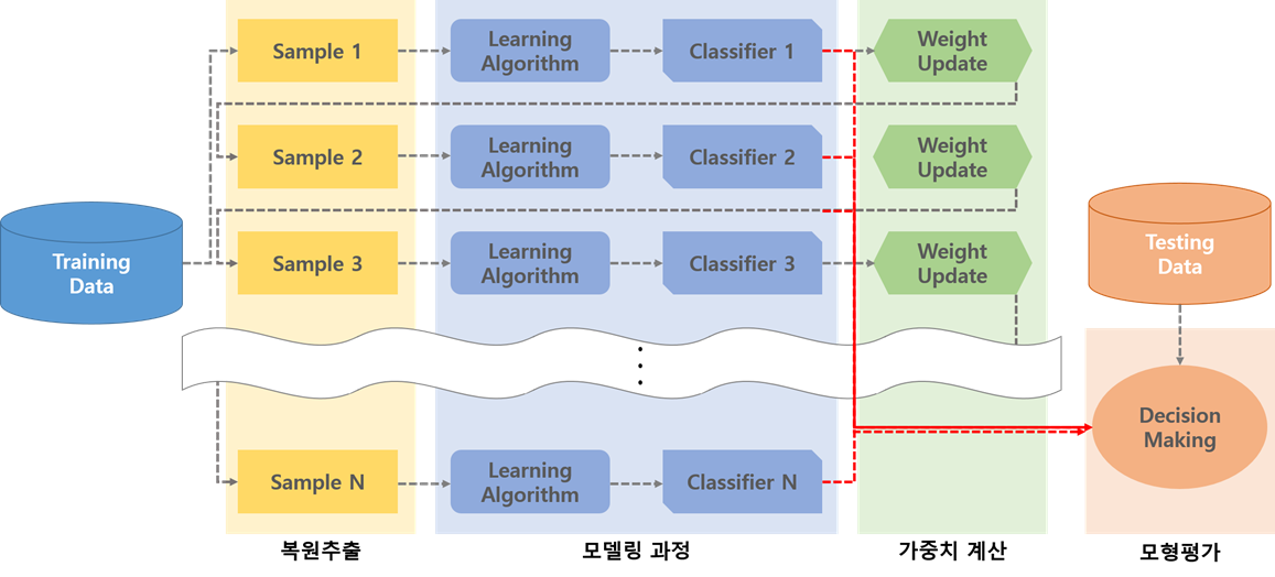 부스팅은 머신러닝 앙상블 기법 중 하나로 약한 학습기를 순차적으로 결합하여 예측/분류 성능을 높이는 알고리즘이다.