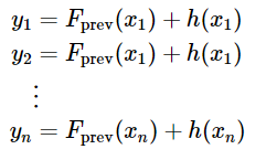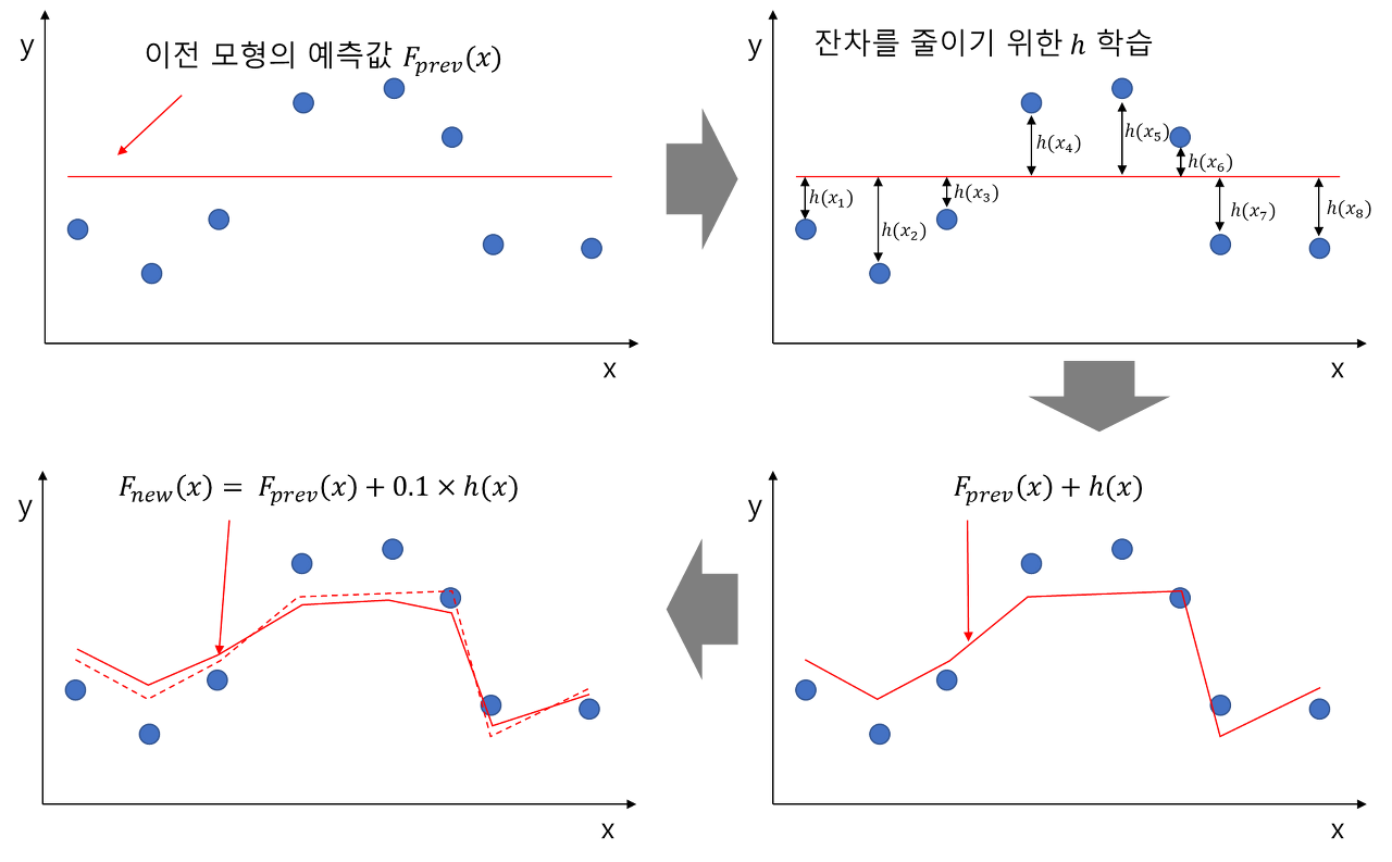 위의 말을 쉽게 적어보자면, 모델 A를 이용하여 $y$를 $y_1$이라 예측했을 때 다음 모델 B는 y가 아닌 $y-y_1$을 예측하는 방식으로 학습된다. 마지막에 이 A, B 모델을 합쳐 y를 예측한다. 그러나 이러한 방식은 과적합을 유발할 수도 있다.