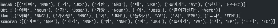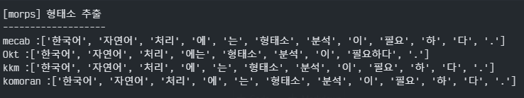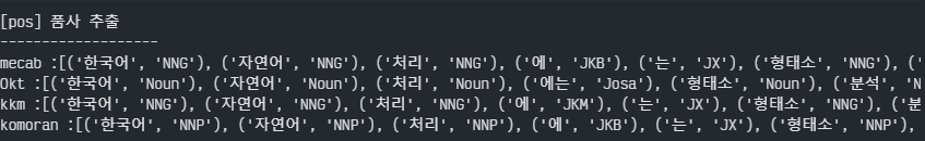 위의 분석기들은 공통적으로 `morphs`라는 형태소 추출, `nouns`=명사 추출, `pos`라는 품사태깅 메서드들을 제공한다.
