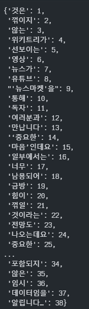 최종적으로 단어사전이 생성되며 각 토큰화된 단어의 단어사전이 생성된 것을 확인할 수 있다.