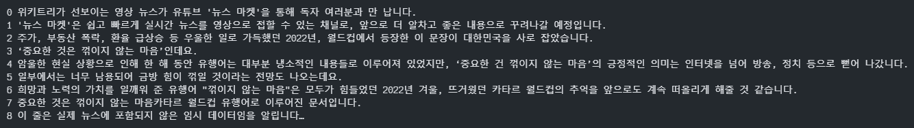 현재 수집된 corpus에는 한 행에 여러 문장이 있기 때문에 추후 모델에 넣을 학습데이터를 구성하는데 편리하기 위하여 문장을 분리할 것이다. 문장 분리에는 한국어 문장분리기로 유명한 `kss` 라이브러리를 이용할 것이다.