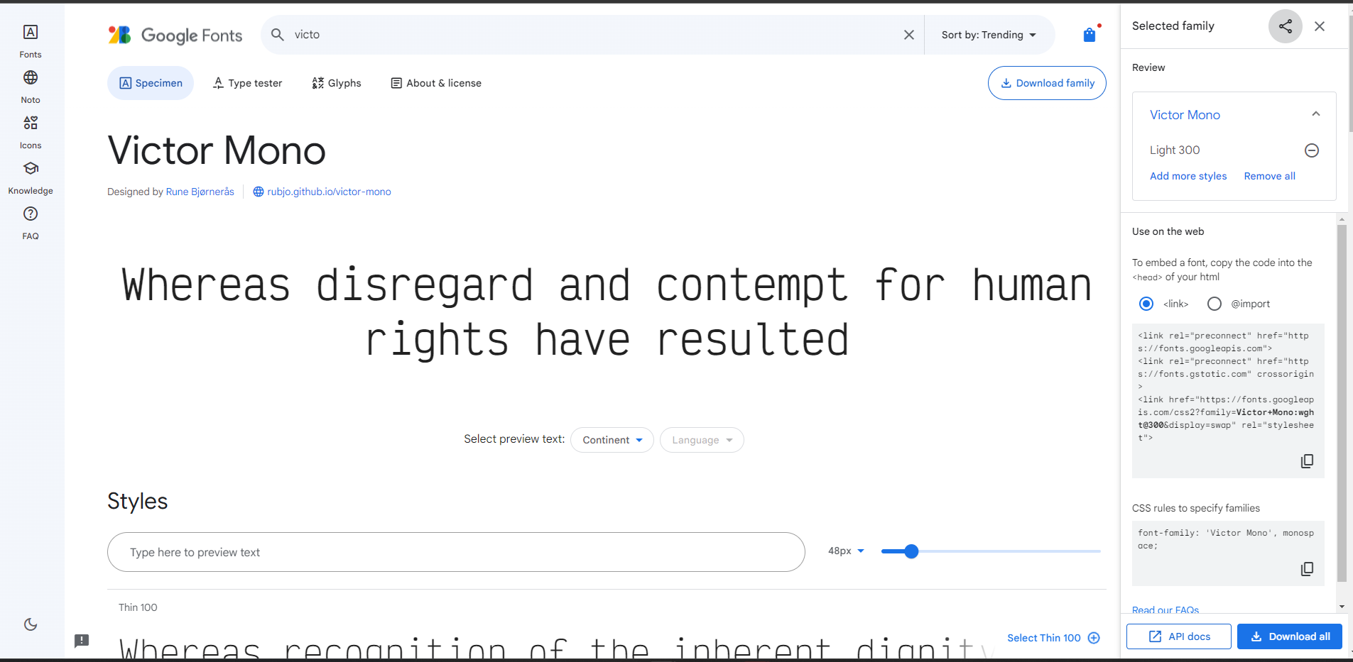 <link href="https://fonts.googleapis.com/css2?family=Victor+Mono:wght@300&display=swap" rel="stylesheet">
