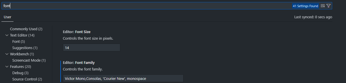 그다음 검색창에 font를 검색하고 자신이 방금 다운로드 받은 폰트의 이름을 `Font Family` 제일 앞에다가 적어주면 된다!!