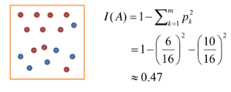 Gini지수는 $ \bf{Gini(D) = 1 - \sum_{i=1}^{J} p_i^2} $ 로 나타내며 최댓값은 0.5이다. 또한 다음과 같이 계산한다.