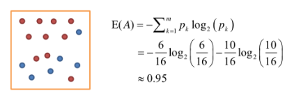 두 번째 방법으로는 Entropy 지수인데, 이는 ID3이라는 tree알고리즘에서 사용되며, 이는 수식으로 $ \bf{H(D) = -\sum_{i=1}^{J} p_i \log_2(p_i)} $이다. 동일한 예제에서 엔트로피지수는 다음과 같다.