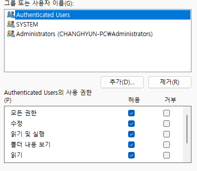 속성->보안으로 들어가서 편집을 눌러 모든 권한을 부여해 준다.(나는 수정? 이랑 뭔가가 거부되어 있었다.)