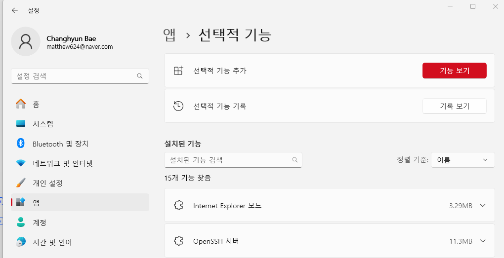 서버로 하고자하는 윈도우pc의 설정에 들어가서 좌측의 앱->선택적 기능-> 선택적 기능 추가 ->OpenSSH서버를 설치하고 재부팅해준다.