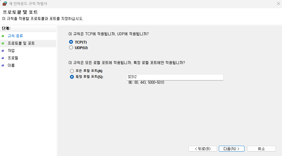 새 규칙을 누른 다음, 포트를 선택하고 다음 TCP와 특정 로컬 포트를 선택하고 아까 지정한 포트번호 32312를 입력한다. 그리고 계속 다음으로 넘기고 맨 마지막 이름과 설명도 아무렇게나 적어주면 끝난다.