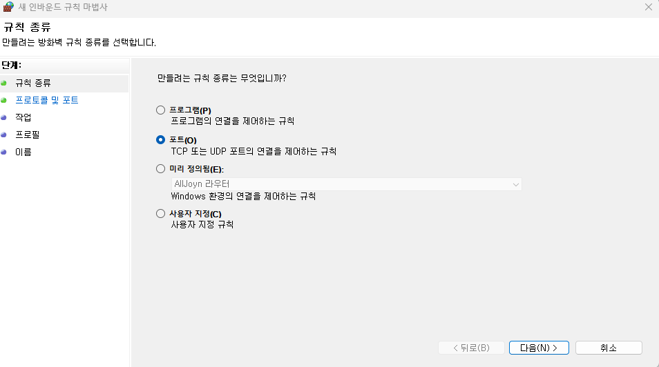 제어판->시스템 및 보안->Windows Defender 방화벽->고급 설정->인바운드 규칙->새 규칙에 들어간다.