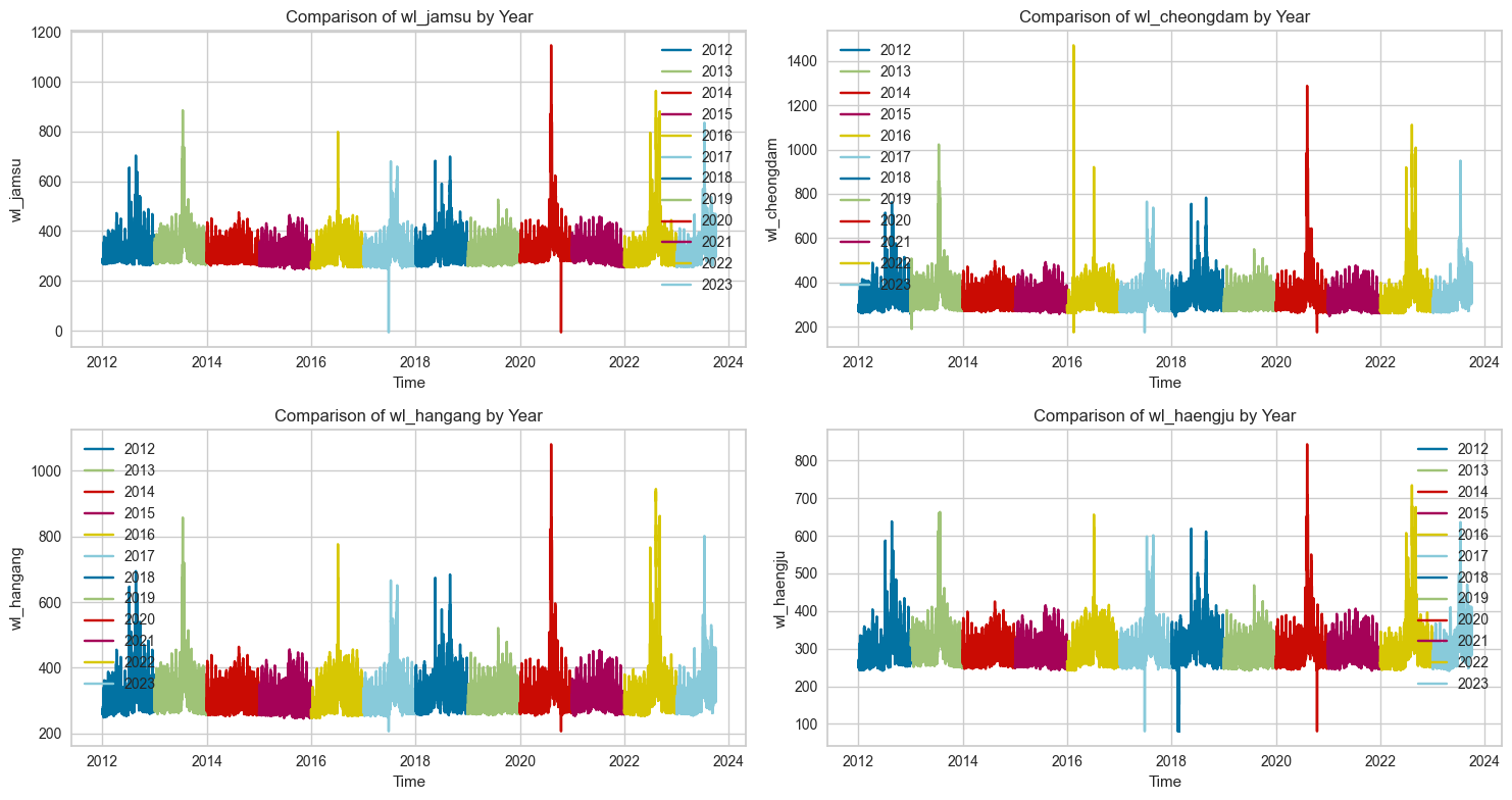 타깃값인 잠수교, 청담대교, 한강대교, 행주대교의 수위를 연도별로 구분하여 확인해 봤는데 중간중간 튀는 값들이 있으나 각각의 대교에서도 연도별로 패턴이 비슷한 걸로 보였고, 4개의 대교가 거의 동일한 수위 분포를 가지고 있었다.