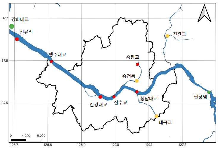 위 그림에서 청담대교->잠수교->한강대교->행주대교 순으로 수위가 변하는 것을 볼 수 있는데 이것은 당연한 결과이며 데이터가 제대로 되었다는 것을 볼 수 있다.
