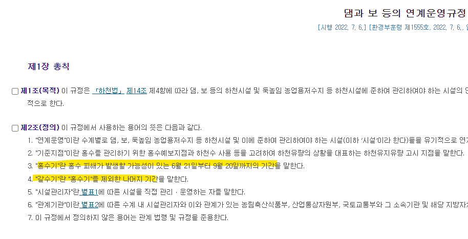 우선 홍수기란 법령으로 지정된 기간으로 6월 21일~9월 20일을 홍수기라고 지정하였고, 그 외를 갈수기라고 한다.