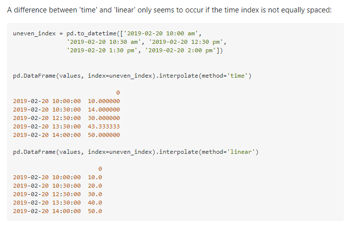 우선 `interpolate(method='time')`과 `interpolate(method='linear')`로 나뉘는데 간단한 예시로 비교해 보자.