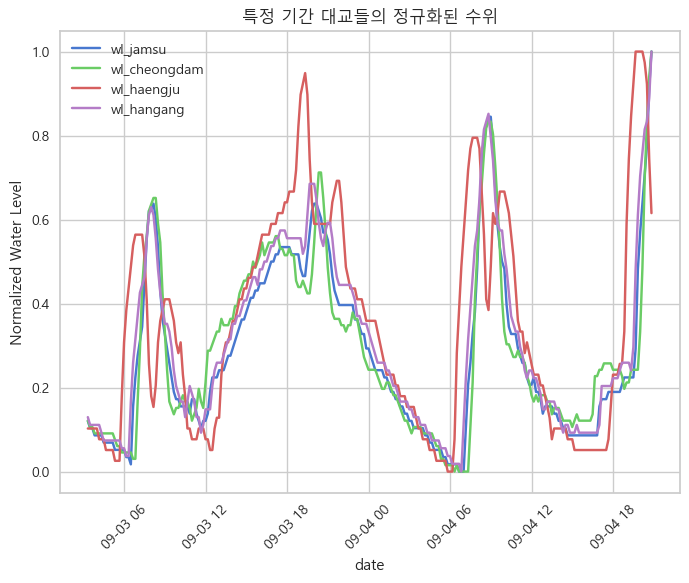 각 대교별로 수위의 스케일이 다르기 때문에 각 대교별로 수위를 0~1로 정규화를 하여 추세만 비교하고자 하였다.