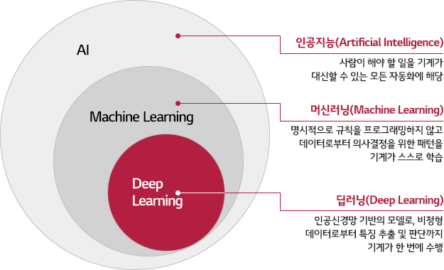 우선 인공지능, 머신러닝, 딥러닝에 대하여 차이점은 간단하게 아래 사진을 통해서 확인할 수 있다.