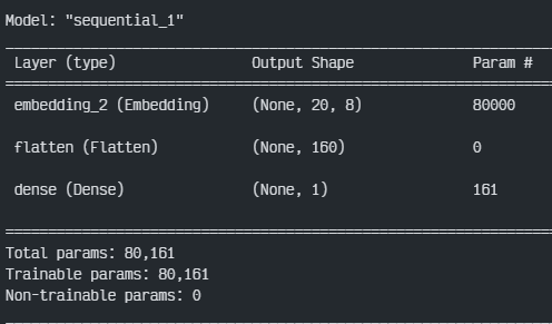 우선 데이터를 다운받은 뒤, 영화리뷰에서 가장 빈도가 높은 10000개의 단어를 추출하고, 20개 이상의 단어로 구성된 리뷰들만 추출한 뒤 Embedding layer을 해당 수집한 것과 맞게 10000,20으로 크기를 정해준다.