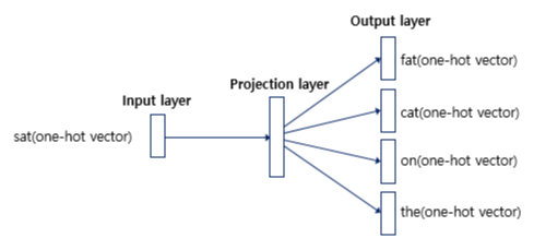 우선 원-핫 벡터로 각 단어가 input으로 들어가게 된다. 이후 projection layer의 크기(=임베딩 벡터의 차원)가 결정된다. 각 input이 들어왔을 때 이를 밀집벡터로 변환하게 해주는, 가중치 $ w $를 학습하는 것이다. 또한 이 projection layer에 압축된 벡터를 다시 늘려줄 가중치 또한 학습한다.
