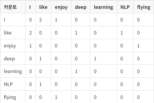 우선 윈도우 기반 동시 행렬에 대하여 짚고 넘어가자. 단어의 동시 등장 행렬은 행과 열을 전체 단어 집합의 단어들로 구성하고, i번째 단어의 윈도우 크기 내에서 k 단어가 등장한 횟수를 i행 k 열에 기재한 행렬을 말한다.