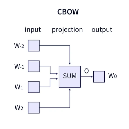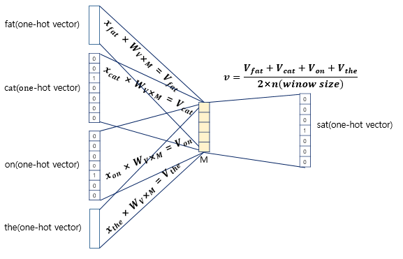 CBOW: Continuos Bag of Words는 주변에 있는 단어들을 보고 중간에 있는 단어를 예측하는 방법이다.