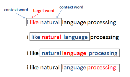 이때 문장하나에 대하여 한번만 학습을 진행하는 것은 아깝기 때문에 Word2Vec에서는 `sliding window`방식을 이용하여 하나의 문장을 가지고 여러 개의 학습 데이터 셋을 생성한다.