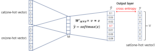 저 projection layer을 거치고 두 번째 가중치행렬을 곱하여 평균을 통해 최종 출력이 나오게 되는데 이를 score vector이라고도 부르며, 이것과 target값에 대한 원하 벡터와 의 차이를 cross entropy를 통해 줄여가며 학습한다.