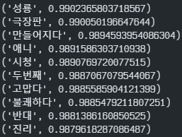 이렇게 임베딩 된 단어들 간의 유사도를 아래와 같이 확인해 볼 수 있다.