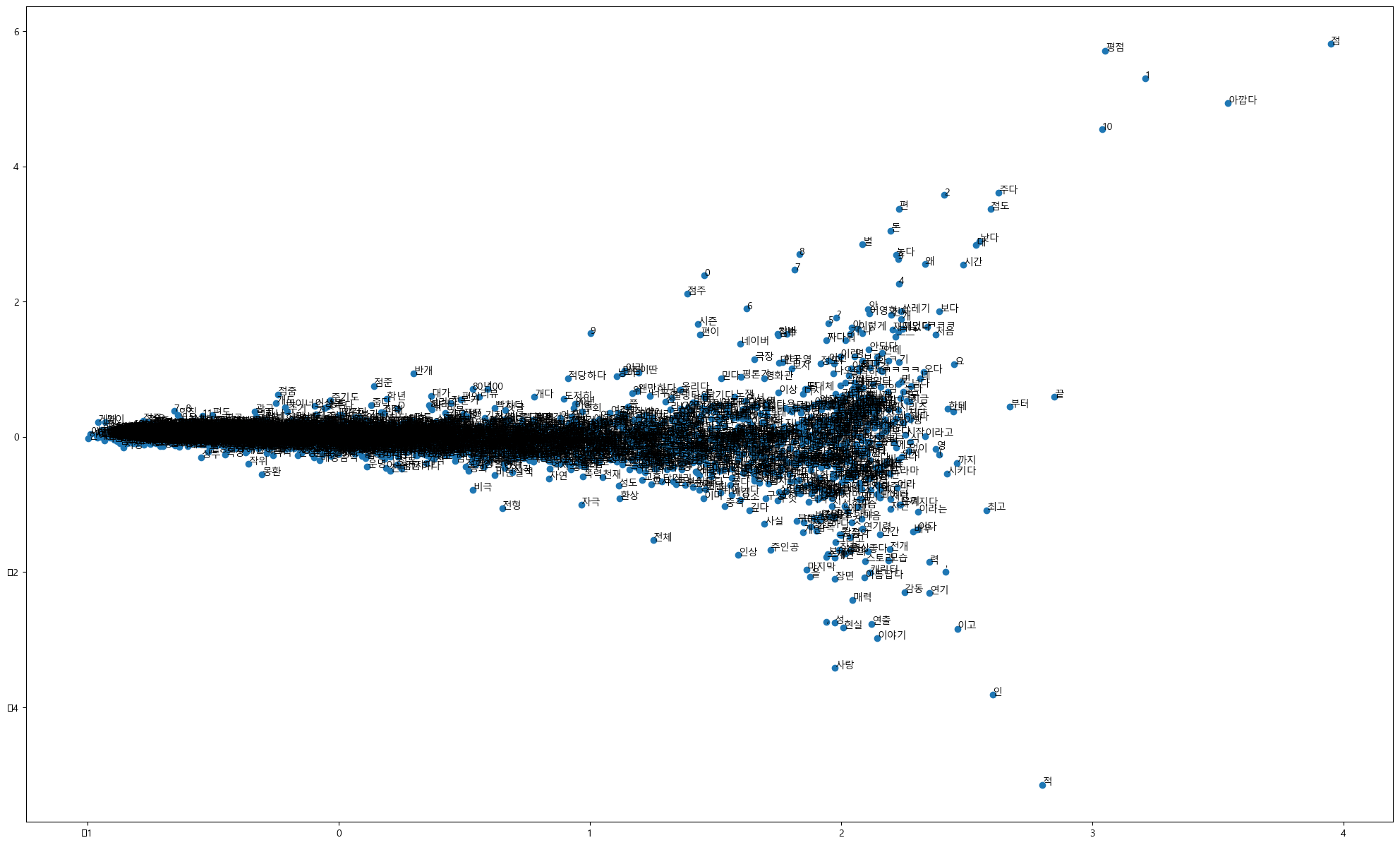 각각의 벡터들을 모두 담은 다음 PCA의 주성분을 2개로 설정하여 진행해 준다.