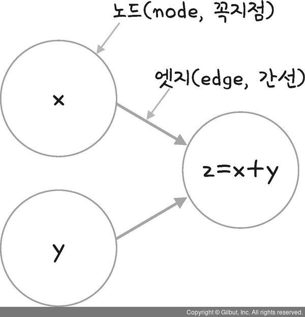 노드(node)는 하나의 연산을 의미하고, 엣지는 노드에 필요한 입력값들을 의미한다.