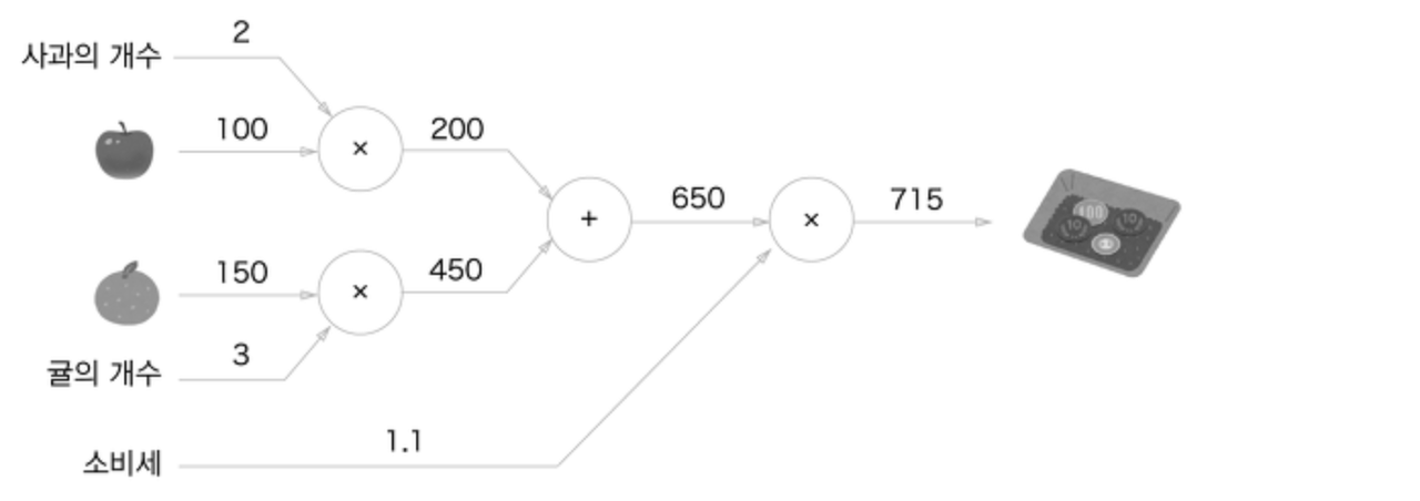 1. 사과를 중심으로 볼 때, 100원과 2개는 각각 입력값(엣지)를 의미한다. 이 둘의 연산(노드)을 통해(여기서는 구매하는 거니까 곱연산) 200이 다음 엣지로 넘어간다.
