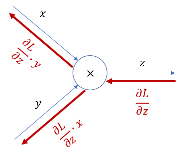 마찬가지로 $y$에 대하여 진행해 보면 $ \frac{\partial L}{\partial y} = \frac{\partial L}{\partial z} \cdot \frac{\partial z}{\partial y} $이고,$ z= x \cdot y $ 이므로, $ \frac{\partial z}{\partial y} $는 $x$ 이다.