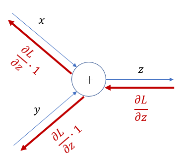 출력이 $z=x+y$ 를 의미하고, 각 파라미터 x와 y에 대해 역전파를 계산해 보면 우선 $ \frac{\partial L}{\partial x} = \frac{\partial L}{\partial z} \cdot \frac{\partial z}{\partial x} $이고, $z= x + y $ 이므로, $ \frac{\partial z}{\partial x} $는 1이다.