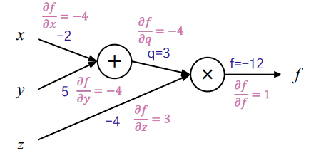 따라서 $ \frac{\partial f}{\partial z}= \frac{\partial f}{\partial f} \cdot 3 $ 이 된다. 이때 이 3은 반대편 엣지인 (x+y) 즉 q를 나타낸다. 다음으로 q에 대한 그래디언트는$ \frac{\partial f}{\partial q} = \frac{\partial f}{\partial f} \cdot -4 $ 이때 -4는 반대편 엣지의 값 z=-4를 의미한다.