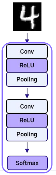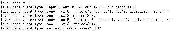 초기값이 위와 같이 설정되어있는데, 확인해 보면, 우선모델의 구조는 conv레이어, relu 활성화함수, pooling레이어로 구성된 블록을 두 번 반복하고 마지막은 softmax를 이용한다.