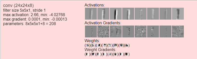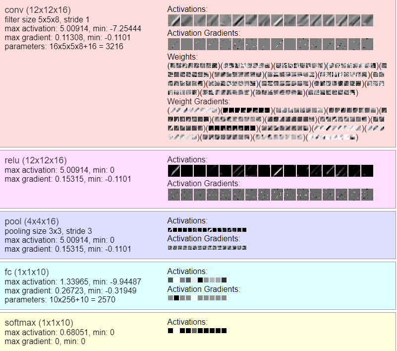 Mnist 데이터셋을 이용한 cnn 데모 페이지인데, 각종 파라미터들을 설정할 수 있으며 중간과정을 확인할 수 있다.